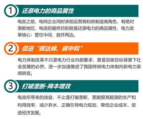电改之前,国家电网同时承担运营商和供制造商角色,有绝对垄断地位。从 2015 年由中央发改委发布(中央( 2015 ) 9 字号文) 国家开 始实施电力改革号召大型工业类用电企业参与电力市场化交易。为了 打破供电局的垄断,并为企业节约用电成本,让私企电力公司参与到售电行业当中。并于 2021 年 10 月 1 开始正式开放一般工商业参与电 力市场化交易。还原电力的商品属性,电力改革核心:管住中间,放开两边。